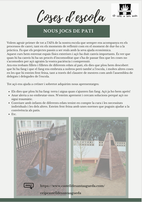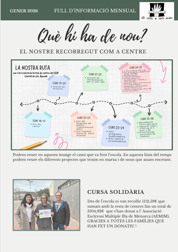 Inici BENVINGUTS I BENVINGUDES A LA NOSTRA ESCOLA LA NOSTRA ESCOLA INSTAL·LACIONS EQUIPS DE CENTRE DOCUMENTS PMT PLA LECTOR SERVEI MENJADOR REVISTES ESCOLARS COMISSIÓ CONVIVÈNCIA CALENDARI ESCOLAR NOVETATS DE L'ESCOLA DIA DE LA NO VIOLÈNCIA I LA PAU SANT ANTONI A L'ESCOLA L’associació de famílies (AFA) ens convida a berenar a l’escola NADAL QUI SOM? EL NOU PATI AGENDA D'ACTIVITATS